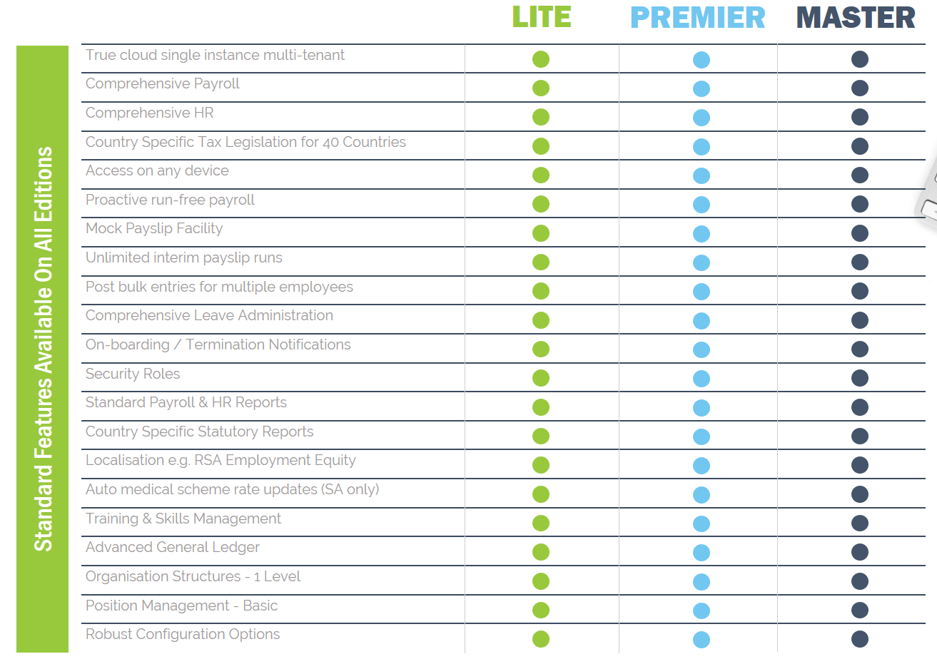 Premier is our most popular, power-packed version for any size organisation that wish to have a fully integrated Human Capital Management System consisting of payroll, HR, Manager Self Service (MSS) and Employee Self Service (ESS).